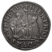 Girolamo Priuli (1559-1567) - Mezzo Ducato da 62 Soldi - Zecca: Venezia - Diritto: il Doge genuflesso riceve da San Marco seduto la benedizione e il vessillo della Repubblica - Rovescio: il leone di San Marco a sinistra con la testa di fronte mostra il Vangelo aperto - read all
