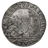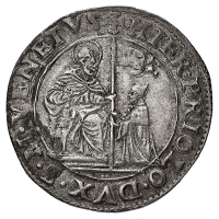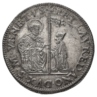 Girolamo Priuli (1559-1567) - Quarto di Ducato da 31 Soldi - Zecca: Venezia - Diritto: il Doge genuflesso riceve da San Marco seduto la benedizione e il vessillo della Repubblica - Rovescio: il leone di San Marco a sinistra con la testa di fronte mostra il Vangelo read all