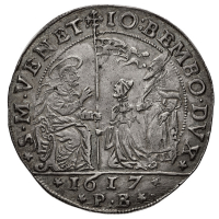 Giovanni Bembo (1615-1618) - Osella Anno III (1617) - Zecca: Venezia - Diritto: il Doge genuflesso riceve da San Marco il vessillo della Repubblica; sulla destra, dietro il Doge, un vescovo appoggia una mano sulla spalla - Rovescio: il Doge inginocchiato a destra tende read all