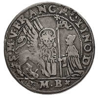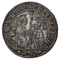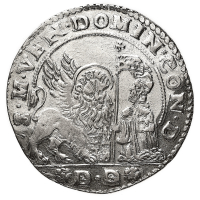 Francesco Molin (1646-1655) - Mezzo Ducato con Santa Giustina da 62 Soldi - Zecca: Venezia - Diritto: il Doge genuflesso verso sinistra stringe il vessillo della Repubblica di fronte al leone alato a destra - Rovescio: Santa Giustina stante in posizione frontale tiene read all