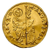 Domenico Contarini (1659-1675) - Ducato con Santa Giustina da 124 Soldi - Zecca: Venezia - Diritto: il Doge genuflesso verso sinistra stringe il vessillo della Repubblica di fronte al leone alato a destra - Rovescio: Santa Giustina stante in posizione frontale tiene con read all