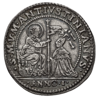 Marcantonio Giustinian (1684-1688) - Osella Anno I (1684) - Zecca: Venezia - Diritto: il Doge genuflesso riceve il vessillo della Repubblica da San Marco che gli siede di fronte - Rovescio: un angelo con il corno dogale in mano, librato in volo verso sinistra su piazza read all