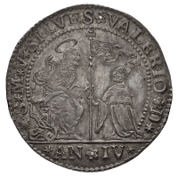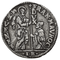 Francesco Morosini (1688-1694) - Mezzo Leone per il Levante - Zecca: Venezia - Diritto: il Doge genuflesso riceve da San Marco il vessillo della Repubblica - Rovescio: il leone di San Marco rampante e retrospiciente regge una croce con la zampa destra e un ramo di palma read all