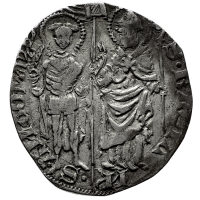 Giovanni II Bentivoglio (1463-1506) - Grossone - Diritto: leone rampante a sinistra tiene uno stendardo; in basso lo stemma ovale dei Bentivoglio - Rovescio: San Petronio seduto tiene con la mano sinistra il pastorale e con la destra il modellino della città - gr. 3,30 read all