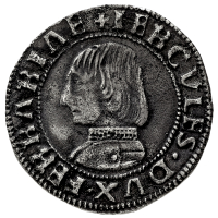 Ercole I d'Este (1471-1505) - Grossone - Diritto: busto del Duca corazzato a sinistra - Rovescio: San Giorgio a cavallo trafigge il drago - gr. 3,27 - Rara - Lieve porosità del metallo, BB - Corredata dal cartellino di Oscar Rinaldi