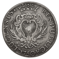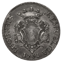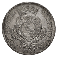 Repubblica (1369-1799) - Scudo 1754 - Diritto: stemma della Repubblica coronato entro due rami di alloro - Rovescio: San Martino a cavallo con elmo e corazza dell'atto di donare a un mendicante parte del proprio mantello - gr. 26,04 - Migliore di BB