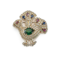 in gilded metal, cabochons and glass paste crystals in shades of green and transparent. It dates from the period when Dior produced its jewelry in Germany and was handmade by Henkel and Grosse.