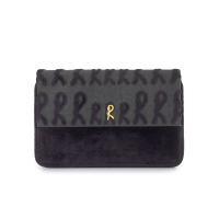 in black canvas and velvet. Black velvet lining. Logoed snap flap closure. Golden-tone metal hardware.