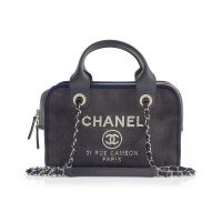 in blue Denim and canvas, blue fabric lining. Double blue leather handle and double shoulder strap with matching leather weave. Two-way zip fastening. Logo and lettering on front. Silver-tone metal hardware.