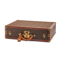 brown Monogram canvas, cowhide handle. Beige Vuittonite lining with six logoed wooden hangers separated by canvas dividers. Central snap-lock closure with two supplementary locks. Includes key and removable name tag. Losine trim with metal corners. Golden-tone metal
