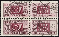 1946/95 - Insieme di valori in blocchi di quattro relativi a pacchi postali (tra cui 300 L. ruota), pacchi in concessione e segnatasse - Due certificati