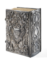 In 8° (180 x 123 mm). Libro di preghiere con legatura in argento fuso, sbalzata con motivi a volute e fitomorfi, medaglione con immagine cabalistica della