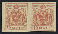 1854 - 15 c. rosso vermiglio III tipo coppia orizzontale - Unita II emissione 10 s. bruno I tipo due esemplari con numerosi difetti - Firme Giulio Bolaffi e A.D.