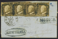 1859 - Modica - Ovale in azzurro su assicurata, ovale in azzurro a lato, per Palermo (arrivata il 15 aprile) affrancata con 1 gr. II tavola bruno oliva chiaro quattro esemplari tra cui pos. 69 "ritocco" - Rara - Cert. Diena