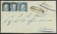 1859 - 2 gr. I tavola azzurro chiaro carta di Napoli striscia orizzontale di tre esemplari ciascuno con l'impronta di un "chiodino" su lettera del 16 ottobre da Nicosia per Palermo - Fresca e ben conservata - Cert. Raybaudi