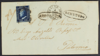1859 - Noto - Ovale su assicurata, ovale a lato, per Palermo (arrivata il 7 febbraio) affrancata con 10 gr. azzurro cupo isolato - Documento da esaminare ma di rarità estrema