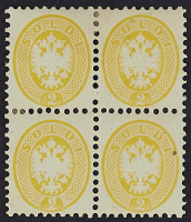 1865 - 2 s. giallo blocco di quattro - Piccola intrusione originaria di un corpo estraneo su un esemplare ma buona centratura per la tipologia