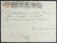 1852 - 80 baj. bianco due coppie orizzontali + 50 baj. azzurro oltremare scuro stampa difettosa + 1 s. rosa carminio in affrancatura "tricolore" su frontespizio di lettera del 6 ottobre 1865 da Roma per l'Ungheria - 50 baj. corto nel lato destro e 1 s. riparato ma read all