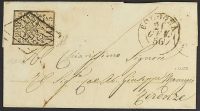 1855 - 5 baj. rosa II tipo su lettera di piccolo formato del 21 gennaio 1856 da Bologna per Firenze - Molto bella - Unito frammento con otto esemplari del medesimo francobollo (da esaminare) - Cert. Bolaffi e Diena