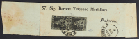 1851/52 - 1 q. nero su carta bianca + 1 s. giallo oro su carta azzurra su piccolo frammento - Da esaminare - Cert. Cardillo