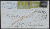 1851/52 - 1 q. nero su carta grigia + 1 s. giallo limone su carta azzurra esemplare singolo e coppia orizzontale su lettera del 5 ottobre 1853 da Firenze per Borgo a Buggiano - Estremamente rara - Da esaminare - Cert. Colla - Firme E.D., Alfredo Fiecchi e Raybaudi