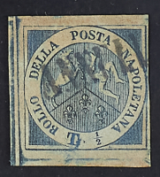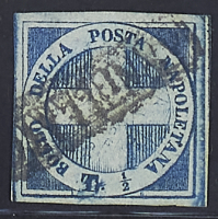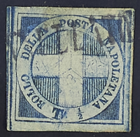 1860 - "Croce" 1/2 t. azzurro con filigrana "globo sormontato da una croce" - Pochi esemplari noti - Lieve assottigliamento ma ben marginato - Cert. Chiavarello - Firme A.D. e Savarese
