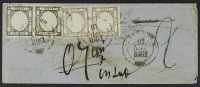 1861 - 1 gr. nero due esemplari + 2 gr. azzurro chiaro + 5 gr. carminio due coppie orizzontali in affrancatura "tricolore" su frontespizio di lettera del 14 luglio 1862 da Napoli per Il Pireo - Minimi difetti da esaminare ma combinazione estremamente rara e finora non read all