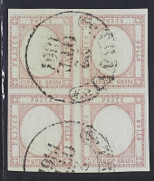 1861 - 5 gr. rosa blocco di quattro - Molto raro - Piccola riparazione al centro della coppia superiore - Da esaminare - Cert. Cilio