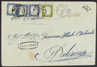 1855 - 5 c. verde oliva giallastro + 20 c. azzurro oltremare tre esemplari su assicurata del 23 marzo 1862 da Sciacca per Palermo - Documento non comune - Da esaminare - Cert. Cardillo
