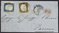 1855 - 5 c. verde smeraldo scuro + 20 c. celeste vivace + 40 c. vermiglio scuro in affrancatura "tricolore" su lettera del 3 marzo 1857 da Genova per Venezia - Non comune - Da esaminare - Cert. Cardillo