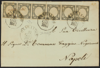 1861 - 1 gr. nero grigiastro striscia orizzontale di cinque ed esemplare singolo su lettera del 20 giugno da Taranto per Napoli - Piega verticale d'archivio che non intacca le cornici dei francobolli interessati - Estremamente rara - Cert. Colla e Diena