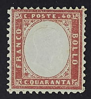1862 - Prima emissione dentellata 40 c. rosso carminio - Cert. Diena
