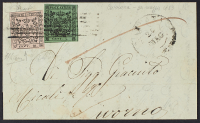 1852/54 - 5 c. verde + 10 c. rosa con errore "N" coricata su lettera del 24 maggio 1853 da Carrara per Livorno - Francobollo da 10 c. applicato in seguito sul documento ma esemplare ben conservato e di una certa rarità - Cert. Colla e Diena