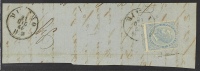 1863 - Definitiva 15 c. celeste chiaro con dentellatura orizzontale fortemente spostata in senso verticale (2mm) su frammento di lettera da Milano del 21 dicembre 1864 - Estremamente raro - Cert. Carraro