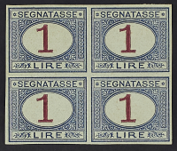 1890 - Definitiva 1 L. azzurro e carminio - Prova di stampa in blocco di quattro su carta grigiastra senza filigrana e dentellatura - Cert. Sorani