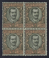 1910 - Floreale 10 L. blocco di quattro - Buona centratura - Cert. Cilio