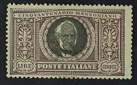 Manzoni 5 L. non dentellato striscia verticale di tre esemplari con filigrana capovolta - Rara - Unito 1 L. non dentellato striscia verticale di quattro bordo di foglio superiore senza gomma - Cert. Raybaudi