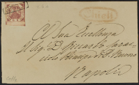 1858 - Carpanzano - Ovale su lettera del 13 gennaio per Catanzaro affrancata con 2 gr. I tavola carminio - Documento parzialmente ricostruito (aggiunta di carta) e francobollo staccato per controllo e ricollocato tramite linguella - Raro - Da esaminare - Cert. Raybaudi