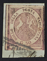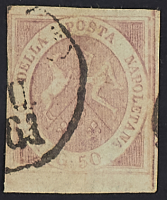1858 - 50 gr. rosa lillaceo bordo di foglio inferiore annullato con bollo circolare - Esemplare molto bello e con filigrana di margine - Cert. Bolaffi e Diena