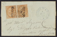1870 - S.M.no - Bollo a punti annullatore di Regno definitiva 10 c. giallo ocra tiratura di Torino due esemplari, doppio cerchio in azzurro a lato, su lettera di piccolo fornmato del 3 febbraio per Pennabilli - Ex collezione Provera - Cert. Diena