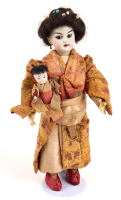 marked "K [star] R 117 A", porcelain head, composition body. Beautiful clothes sewn from antique fabrics. Includes small table and tea set.
