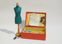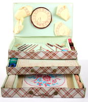 Includes various needlework tools, such as a small circular embroidery hoop, needles, colored threads, spools, and tools with bakelite or wooden handles.