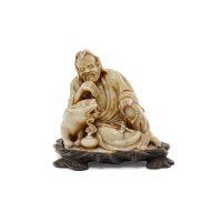 Stone of creamy tone, the seated deity holding a rosary in her left hand, her right resting on the back of the tamed tiger, a bowl on the ground from which fumigations flow, incised signature on the bottom, wooden base.