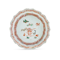 Porcelain with wall and rim modelled in ogives, the delicate decoration of lotus flowers and birds painted in polychrome enamels of the ‘Famille Verte’ palette and gold.