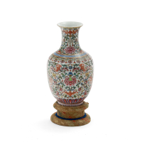 Porcelain painted with polychrome enamels, the body and the neck with a fine decoration of floral arabesques of peony and lotus among which bats and knot symbols, the shoulder with bands of stylised flowers, towards the base a band with