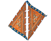 Silk embroidered with multicolored and gold threads, orange ground, both with a dragon in flight chasing the Pearl amidst clouds and darts, two sides with stylized waves, one with blue ground and the character shou ("longevity") repeated seven times.