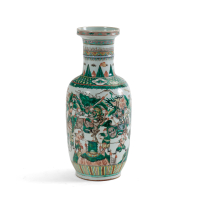 Porcelain with polychrome enamel decoration, the body with a landscape scene crowded with soldiers and deities, some riding mythological animals, the areas towards the base, shoulder and neck with bands of geometric motifs and stylised leaves and flowers.