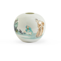 Porcelain painted with polychrome enamels, the body with a scene with some figures on a veranda assisting to a sword fight between two deities on clouds, section towards the base, shoulder and neck with floral motifs reserved on a geometric ground.
