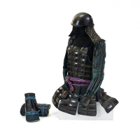 Lacquered leather, metal, silk, incomplete, with helmet, breastplate, arm and thigh guards, and shin protection, the back of the breastplate with two gilt characters within a round medallion.