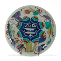 Nabeshima-type porcelain with polychrome enamel decoration of auspicious objects, to the center the character kotobuki ("longevity")